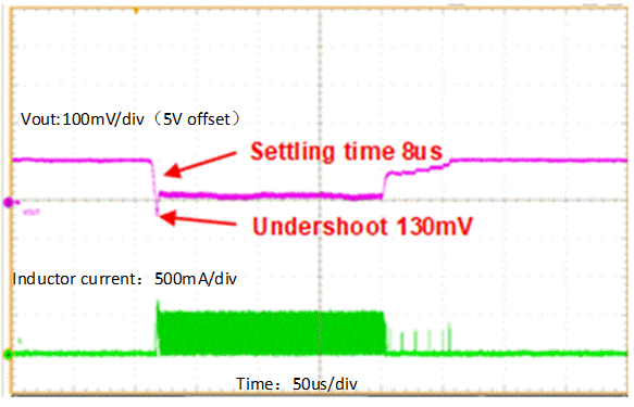 然而,TPS61299 可實現(xiàn)更快的瞬態(tài)響應(yīng)時間,且?guī)捀鼘。例如,?nbsp;3.6V 輸入和 5V 輸出條件下,輸出電流從 0mA 升高至 200mA 的典型穩(wěn)定時間是 8µs,如圖 9 所示。
