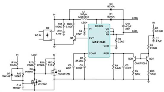 MR16 LED 燈采用升壓配置的 MAX16840 HB LED 驅(qū)動器原理圖。這種配置提供了與電子變壓器良好的兼容性。
