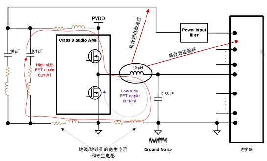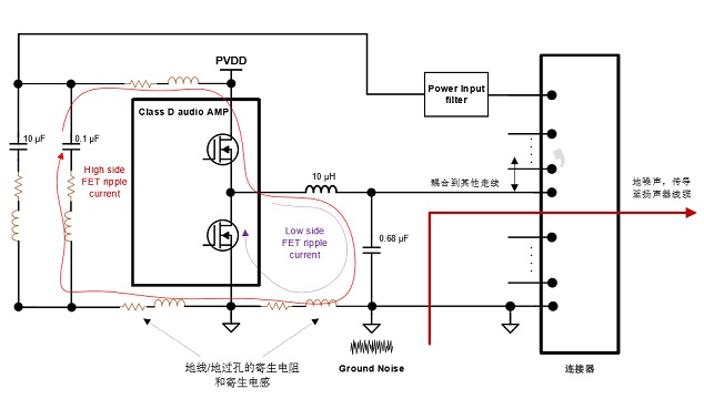 地噪聲來源分析:由于開關紋波電流流過寄生電感/電阻,造成參考地(Reference Ground)和功放地之間的電壓偏差。地噪聲會通過音頻功放傳導至喇叭線(或者其他走線)影響傳導/輻射測試結果。
