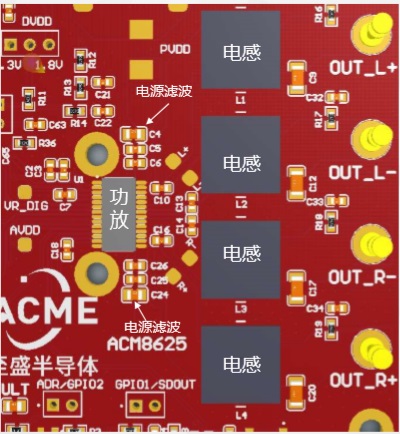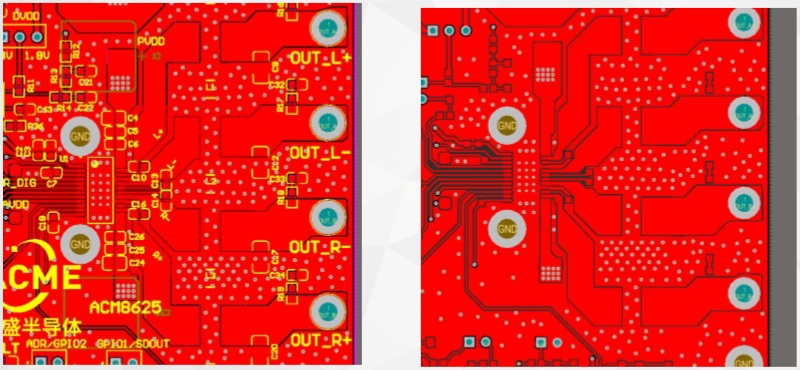 1)PCB板布局過(guò)于緊湊,功率密度太大,狹小的空間內(nèi)布局2顆ACM8625P功放.