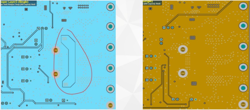 2) 在大信號(hào)播放時(shí),功放芯片通過(guò)引 腳和底部散熱片向PCB散熱,由于周邊銅皮被切割成孤島,影響熱量傳導(dǎo),長(zhǎng)時(shí)間后芯片過(guò)熱保護(hù).