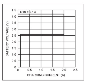 低于 2.6V 的區(qū)域需要不同的充電技術(shù)。如果嘗試對放電電壓低于 2.6V 的電池充電,充電器會施加低值(“調(diào)節(jié)電流”)充電電流,直到電池達到 2.6V 電平。這是鋰離子電池過度放電時的行為所必需的安全機制。當 VBATT < 2.6V 時強制快速充電電流可能會導致電池進入不可逆的短路狀態(tài)。