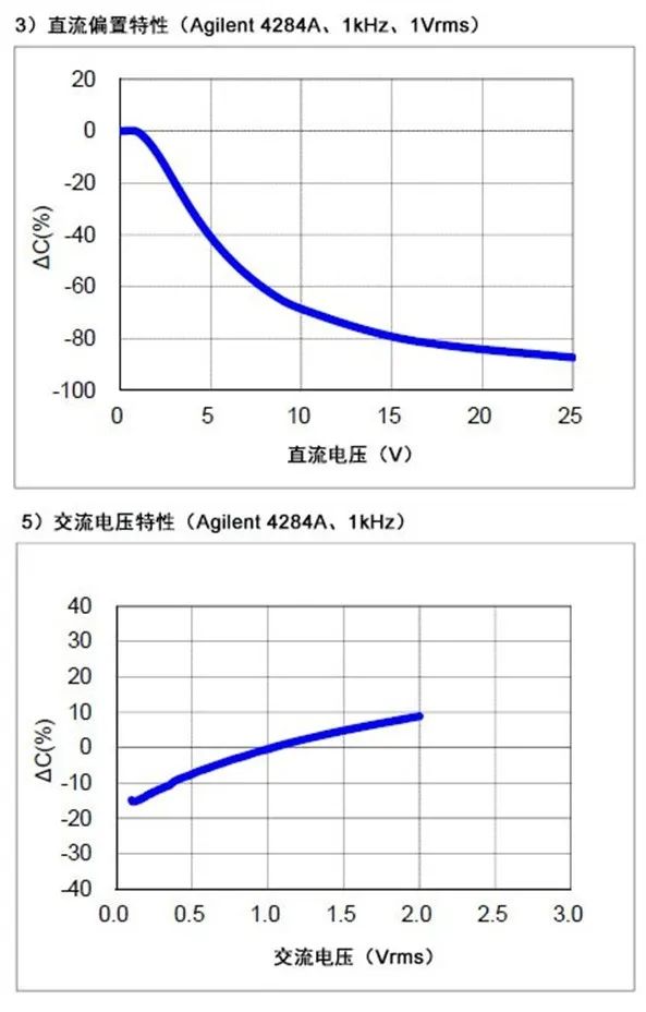 測(cè)試信號(hào) : 舉例而言,下圖摘自 CL31A106KAHNNNE 特性表 ,展示了直流偏置和交流測(cè)試信號(hào)振幅對(duì)觀測(cè)的電容值產(chǎn)生的影響。在這種情況下,稍微改變交流電測(cè)試信號(hào)的振幅,就會(huì)導(dǎo)致觀測(cè)的電容值出現(xiàn) -15% 到 +10% 之間的浮動(dòng)。而直流偏置造成的影響更大;在僅有四分之一的額定電壓的情況下,設(shè)備的電容會(huì)降低一半。對(duì)于那些認(rèn)為所有偏差都不會(huì)超出標(biāo)稱的 +/-10% 容差值的人來說,這可能會(huì)讓他們大吃一驚。