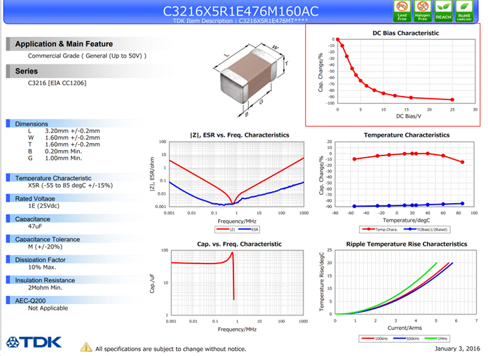 靜態(tài)容量隨其直流偏置工作電壓的增大而減少,最大甚至?xí)陆?0%。比如一個(gè)X5R 47UF 25V的電容,在25V的直流電壓下,其容量可能只有4.7uF,下圖附錄TDK 一個(gè)X5R電容的規(guī)格書 關(guān)于容量與電壓的關(guān)系圖,(其實(shí)仔細(xì)看下圖的的話,你會(huì)發(fā)現(xiàn)電容容量溫度跟容量也有關(guān)系)