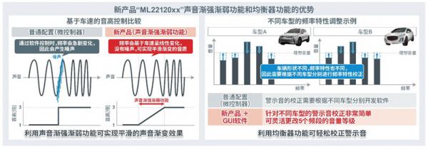 “ML22120xx”由具備警示音生成功能、聲音漸強漸弱功能和均衡器功能的專用硬件構(gòu)成。另外,通過使用專用的GUI軟件,可以輕松滿足相關(guān)法律法規(guī)對AVAS所需的音量和頻率特性等的規(guī)定*2。