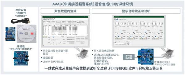 評估板“RB-D22120TB32”和專用GUI(Graphical User Interface)軟件通過聲音設備控制套件“SDCK3”的形式提供。利用該套件,客戶可輕松評估從生成音頻數(shù)據(jù)到校正和試聽警示音的一系列過程。