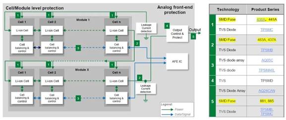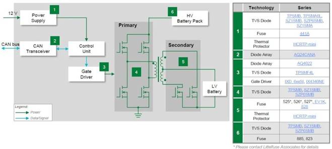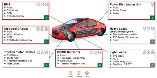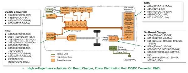 Littelfuse作為全球保護(hù)器件的領(lǐng)導(dǎo)品牌,汽車(chē)硬件回路的過(guò)壓過(guò)流保護(hù)產(chǎn)品自然也少不了,保險(xiǎn)絲做為過(guò)流保護(hù)器之一,在電池管理系統(tǒng)、車(chē)載充電機(jī)、配電單元、直流變換器等應(yīng)用最為廣泛,其中電池管理系統(tǒng)采用貼片保險(xiǎn)絲,其余使用引線或鎖螺栓保險(xiǎn)絲。另外控制板與信號(hào)端口等為了提高重復(fù)使用率可以采用PTC熱敏電阻作為過(guò)流保護(hù),又叫自恢復(fù)保險(xiǎn)絲。