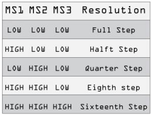MS1, MS2 和 MS3針腳用于微步設(shè)置,如上圖所示。ENABLE針腳用于打開和關(guān)閉場(chǎng)效應(yīng)管的輸出,低電平打開,高電平關(guān)閉。
