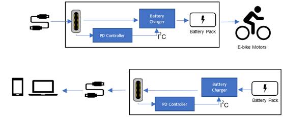 圖 1:通過 USB 為電動自行車充電(上)和通過電動自行車為個人設備充電(下)