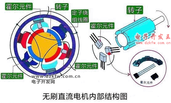 霍爾元件是一種磁感應(yīng)傳感器,可以檢測(cè)磁場(chǎng)的極性,將磁場(chǎng)的極性變成電信號(hào),送給對(duì)應(yīng)的晶體管的控制極。定子繞組中的勵(lì)磁電流是根據(jù)霍爾元件的信號(hào)進(jìn)行切換,這樣就可以形成旋轉(zhuǎn)磁場(chǎng),驅(qū)動(dòng)轉(zhuǎn)子旋轉(zhuǎn)。