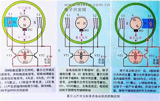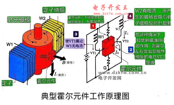 霍爾元件安裝在無刷直流電機(jī)靠近轉(zhuǎn)子磁極的位置,輸出端分別加到兩個(gè)晶體三極管的基極,用于輸出極性相反的電壓,控制晶體三極管導(dǎo)體與截止,從而控制繞組線圈中的電流,使其繞組線圈產(chǎn)生磁場(chǎng),吸引轉(zhuǎn)子連續(xù)運(yùn)轉(zhuǎn)。詳細(xì)見圖中提示;