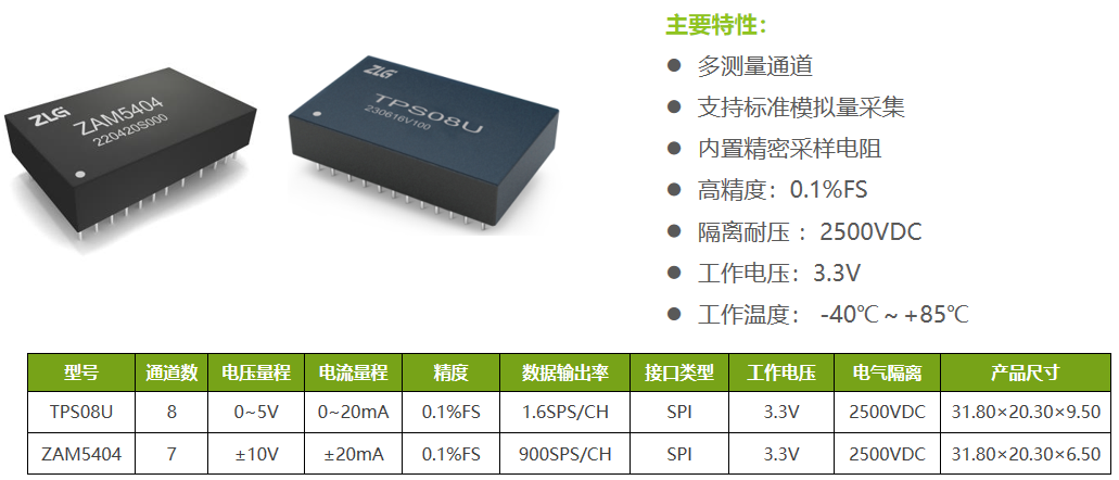 ZAM5404 是一款帶有電氣隔離功能的高精度模擬量采集模塊,集16 位ADC、信號調(diào)理電路、信號隔離和電源隔離于一體,可以實現(xiàn)高精度的電流和電壓采集,可用于±20mA/±10V 工業(yè)標準的傳感器輸出信號采集具有8 個采集通道,包括4 個電流采集通道和4 個電壓采集通道。