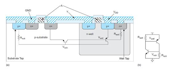 通常,BJT 晶體管處于關(guān)閉狀態(tài)。但當(dāng)電流流過基板(R sub)時(shí),V sub將上升,這將使 NPN 晶體管導(dǎo)通。結(jié)果,NPN 晶體管將電流拉過 Rwell ,從而導(dǎo)通 PNP 晶體管。