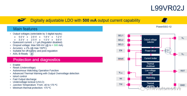 L99VR02J能夠直接連接到電池,具有使能、復(fù)位、自主看門狗、先進(jìn)熱報警、快速輸出放電和IShort控制功能。