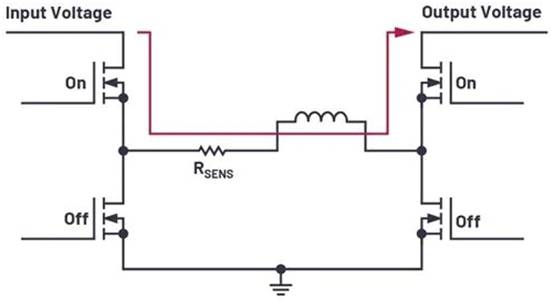 圖2所示為配有直通模式的新 LT8210 降壓-升壓控制器電路的功率級(jí)。在這種模式下,H橋的兩個(gè)高端開(kāi)關(guān)永久開(kāi)啟,兩個(gè)低端開(kāi)關(guān)永久關(guān)閉。通過(guò)這種方式,根據(jù)電流和電壓情況,可以實(shí)現(xiàn)近乎100%的效率。