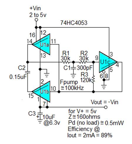 U1a和U1b與C2結(jié)合形成反相電容器電荷泵,將電荷傳輸?shù)綖V波電容器C3。電荷轉(zhuǎn)移發(fā)生在一個(gè)周期中,該周期以 C2 通過 U1a 充電到 V+ 開始,然后通過 U1b 將 C2 部分放電到 C3 來完成。在 U1c 施密特觸發(fā)器型振蕩器的控制下,泵浦頻率約為 100 kHz,因此每 10s 就會(huì)發(fā)生電荷轉(zhuǎn)移。注意 U1c 周圍通過 R3 的正反饋和通過 R1、R2 和 C1 的反向反饋。