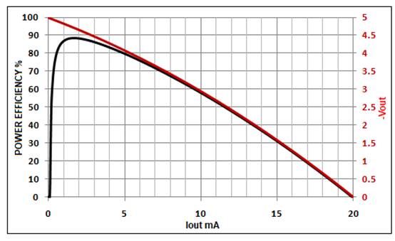 空載功耗小于 500 W,大致平均分配在 U1 和振蕩器 RC 網(wǎng)絡(luò)之間。當(dāng) Vout 輕載時(shí),它將地接近 -1.0 x V+。在負(fù)載下,它會(huì)以~160 mV/mA的速度下降。
