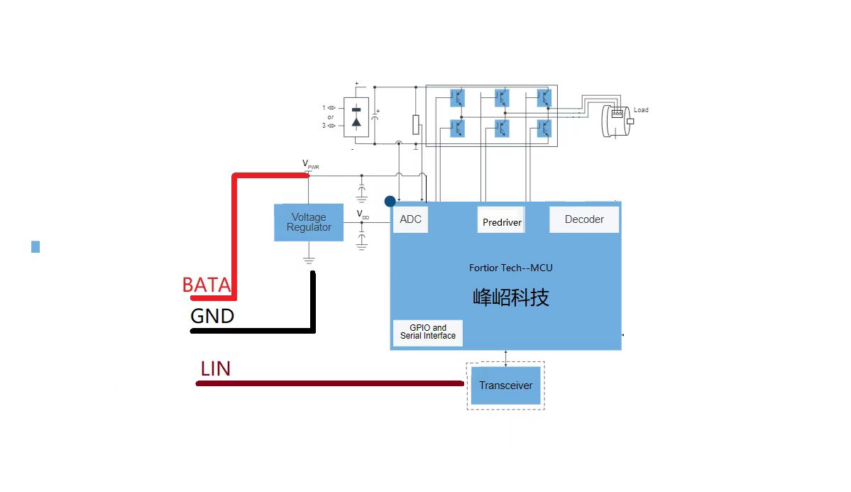 上圖為緊湊型電機(jī)控制解決方案框圖,其中左邊的是電源和LIN信號(hào)輸入,圖的上邊是BLDC電機(jī);實(shí)際控制中,控制器接收LIN總線信號(hào)進(jìn)入喚醒正常工作狀態(tài),正常運(yùn)行時(shí)使用位置閉環(huán)控制電機(jī)運(yùn)行到指定位置。