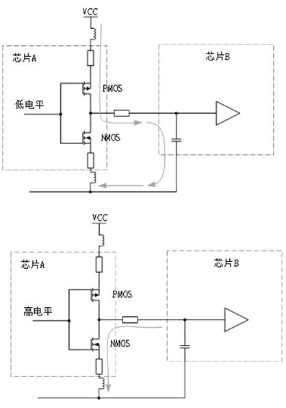 (2)芯片外部電源引腳提供給內(nèi)部晶體管一個(gè)公共的電源節(jié)點(diǎn),當(dāng)晶體管狀態(tài)轉(zhuǎn)換時(shí)必然引起電源噪聲在芯片內(nèi)部傳遞。