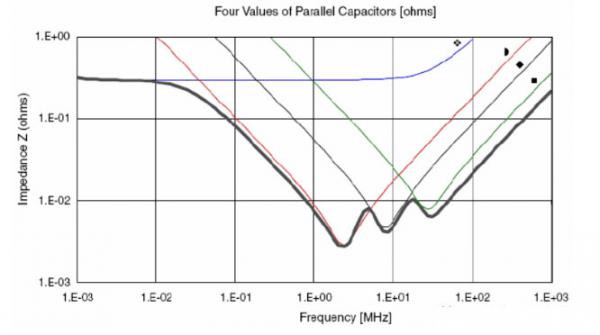 用一個(gè)電容組合的例子。這個(gè)組合使用的電容為:2個(gè)680uf鉭電容,7個(gè)2.2uf陶瓷電容(0805封裝),13個(gè)0.22uf陶瓷電容(0603封裝),26個(gè)0.022uf陶瓷電容(0402)。圖中上部平坦的曲線是680uf電容的阻抗曲線,其它三個(gè)容值的曲線為為圖中三個(gè)V字曲線,從左到右2.2uf →0.22uf→ 0.022uf?偟淖杩骨為底部粗包路線。