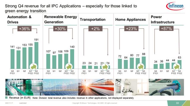基于對英飛凌2021 和2022 財年每季度營收對比來看,自動化和驅動、家電以及電動汽車這三個領域是電機控制系統(tǒng)應用的主要市場增長點。這3 大電機驅動的支柱可以很好地反映全球電機驅動的發(fā)展。根據(jù)市場咨詢公司分析師的觀點以及客戶對市場的看法,認為電機驅動在2023 年的增長相對平穩(wěn)。