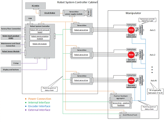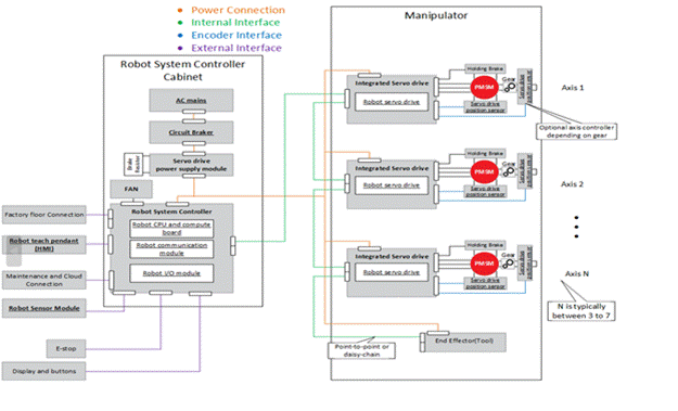 雖然集中式控制架構(gòu)可以滿足重有效載荷工業(yè)機(jī)器人等大功率自動(dòng)化系統(tǒng)的性能和效率設(shè)計(jì)要求,但這些系統(tǒng)需要使用額外電纜,連接機(jī)柜和關(guān)節(jié)的機(jī)械電機(jī),以及位置傳感器和聚合器。這些電線不僅成本高昂,而且容易磨損,需要維護(hù)。