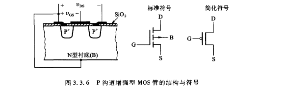 P 溝道增強型 MOS 管的符號如圖3.3.6中所示,其中襯底上指向外部的箭頭表示導電溝道為 P型。
