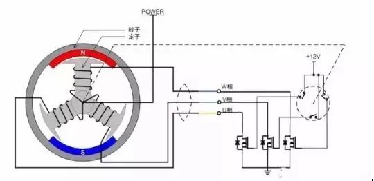 如圖2所示為無刷直流電機(jī)的轉(zhuǎn)動(dòng)原理示意圖,為了方便描述,電機(jī)定子的線圈中心抽頭接電機(jī)電源 POWER,各相的端點(diǎn)接功率管,位置傳感器導(dǎo)通時(shí)使功率管的 G極接 12V,功率管導(dǎo)通,對(duì)應(yīng)的相線圈被通電。由于三個(gè)位置傳感器隨著轉(zhuǎn)子的轉(zhuǎn)動(dòng),會(huì)依次導(dǎo)通,使得對(duì)應(yīng)的相線圈也依次通電,從而定子產(chǎn)生的磁場方向也不斷地變化,電機(jī)轉(zhuǎn)子也跟著轉(zhuǎn)動(dòng)起來,這就是無刷直流電機(jī)的基本轉(zhuǎn)動(dòng)原理——檢測轉(zhuǎn)子的位置,依次給各相通電,使定子產(chǎn)生的磁場的方向連續(xù)均勻地變化。