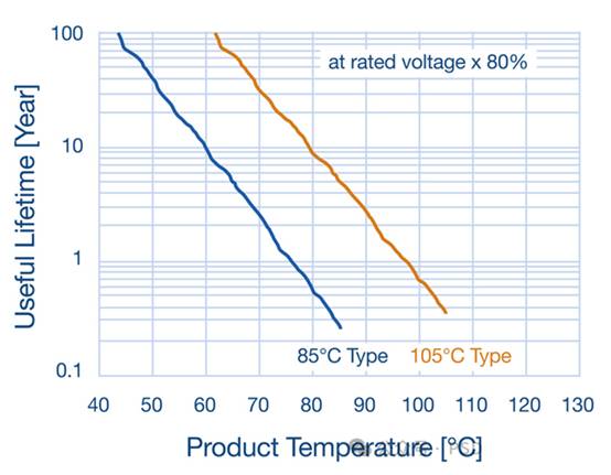 高溫會對元器件的可靠性產(chǎn)生巨大影響。圖2所示為額定溫度+85°C和+105°C的多層陶瓷電容器(MLCC)的預計壽命可靠性。從中可見,當工作溫度為50°C時,額定溫度+85°C的MLCC使用壽命為40年;如果平均工作溫度升高10°C至60°C,那么它的使用壽命就會縮短至10年。