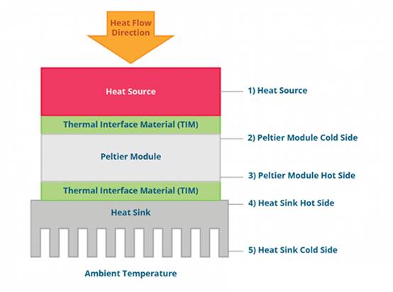 圖4:使用珀爾帖模塊時,從熱源到散熱器的溫度梯度(圖源:CUI Devices)