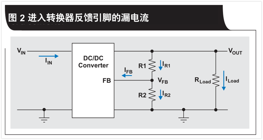 我們剛剛討論了如何利用大反饋電阻來提高效率。然而,選擇的電阻過大則會影響轉(zhuǎn)換器的輸出電壓精確度。因為存在進(jìn)入轉(zhuǎn)換器反饋引腳的漏電流。