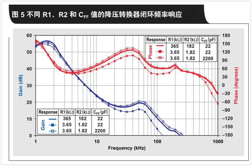 對于一個在其控制拓?fù)渲惺褂们梆侂娙莸霓D(zhuǎn)換器來說,改變電阻式分壓器的值很容易讓轉(zhuǎn)換器穩(wěn)定降低。但是這個例子僅僅表明,只要前饋電容調(diào)節(jié)適當(dāng),改變這些值便可維持相同的頻率響應(yīng)和瞬態(tài)響應(yīng)