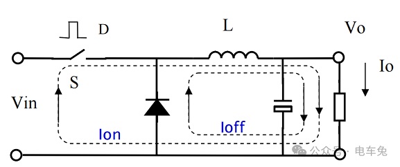 開關(guān)斷開階段:當(dāng)開關(guān)斷開,電感維持電流的連續(xù)性,通過續(xù)流二極管向蓄電池和負(fù)載釋放能量,完成能量的轉(zhuǎn)移和存儲(chǔ)。