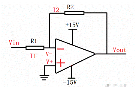 聯(lián)立公式(1)(2)(3)(4)可求得 Vout / Vin = - (R2 / R1),即Vout = -Vin (R2 / R1)