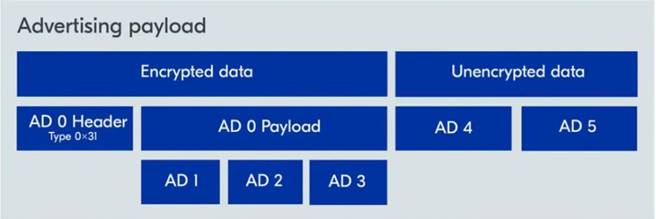 廣播數(shù)據(jù) 0 封裝 AD 1-3,這些數(shù)據(jù)是加密的。隨后是 AD 4 和 AD 5,它們是未加密的。這樣就可以靈活地保留一些非關(guān)鍵的廣播數(shù)據(jù),供任何觀察者解讀,例如 AD 類型 0x01(標志)或 0x09(完整本地名稱)。