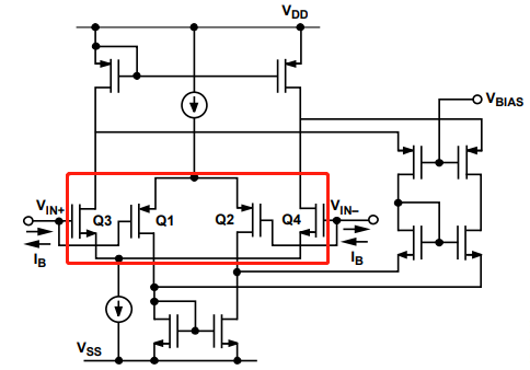 我們不難發(fā)現(xiàn),與前文三種不支持軌到軌的輸入架構(gòu)相比,軌到軌輸入運(yùn)放在輸入的時(shí)候額外多了一對管子,無論是三極管還是MOS管。