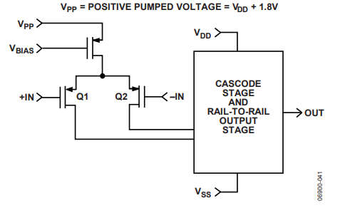 內(nèi)部電荷泵用一個(gè)高電壓,可以使輸入信號始終經(jīng)過一個(gè)差分對而不跳到另外一個(gè)。某種意義上,是從根本消除了交越失真。