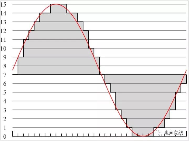 下圖反映了數(shù)字電路在采樣過(guò)程中呈現(xiàn)的波形,一個(gè)臺(tái)階可以看作是一次采樣,顯然,這些采樣臺(tái)階7越多,就越接近原來(lái)的正弦波形。