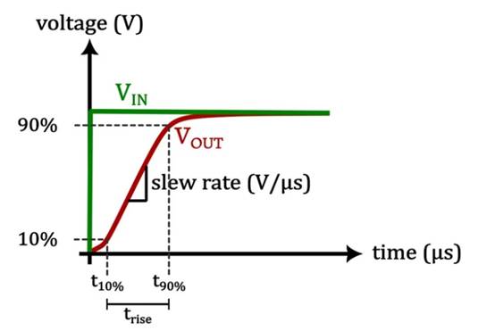 我們可以將上升時(shí)間(上圖中的 trise)定義為信號(hào)從其新值的 10% 增加到 90% 所需的時(shí)間。下降信號(hào)的轉(zhuǎn)換率類似,的區(qū)別是我們現(xiàn)在測(cè)量從 90% 下降到 10% 的變化。請(qǐng)注意,本文的其余部分將僅討論上升輸出信號(hào)的轉(zhuǎn)換速率限制。