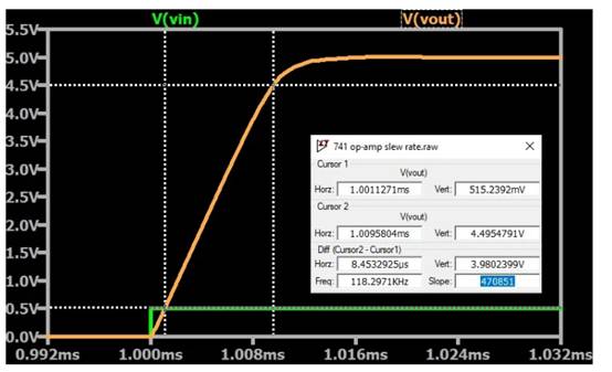 圖 4. LTspice 的光標(biāo)功能使我們能夠測(cè)量輸出斜坡的斜率。圖片由羅伯特·凱姆提供從V OUT = 0.5 V 到V OUT = 4.5 V的輸出信號(hào)看起來(lái)非常線性。上升時(shí)間約為 8.5 μs,接近我們的理論值。波形這部分期間的斜率為 470,851 V/s,約為 0.47 V/μs。這表明仿真中使用的 SPICE 模型成功地再現(xiàn)了預(yù)期的約 0.5 V/μs 的 741 轉(zhuǎn)換速率。