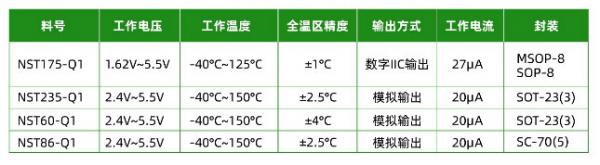 納芯微宣布推出車規(guī)級(jí)數(shù)字輸出溫度傳感器NST175-Q1和模擬輸出溫度傳感器NST235-Q1、NST86-Q1、NST60-Q1。這些溫度傳感器采用高性能、高可靠性的CMOS測溫技術(shù),具備全溫區(qū)高精度、高線性度、低功耗和高集成度等特點(diǎn),無需額外電路,且能有效替代無源熱敏電阻,是極具性價(jià)比的系列產(chǎn)品。