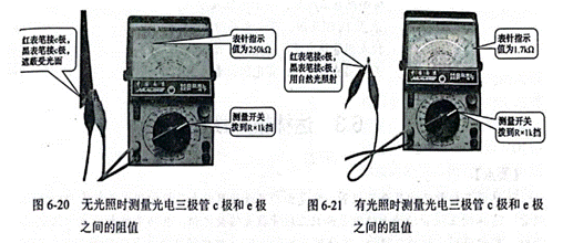 在進(jìn)行受光檢測(cè)時(shí),萬用表仍選擇R×1k擋,黑表筆接c極,紅表筆接e極,讓光線照射光電三極管受光面,正常光電三極管阻值應(yīng)變小。在無光和受光檢測(cè)時(shí)阻值變化越大,表明光電三極管靈敏度越高,如圖6—20、圖6—21所示。