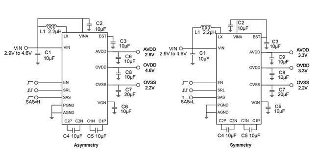 在對(duì)稱模式下,SAS設(shè)置為L(zhǎng)ow電平,AVDD、OVDD和OVSS的初始輸出電壓分別為3.3V、3.3V和-2.2V。在不對(duì)稱模式下,SAS設(shè)置為High電平,AVDD、OVDD和OVSS的初始輸出電壓分別為2.8V、4.6V和-2.2V。