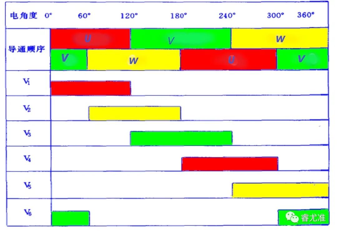 永磁體N-S交替交換,使位置傳感器產(chǎn)生相位差120H3、H2、H1方波,從而產(chǎn)生有效的六狀態(tài)編碼信號(hào):010、011、001、101、100、110,通過(guò)邏輯組件處理產(chǎn)生V6-V1導(dǎo)通、V5-V6導(dǎo)通、V4-V5導(dǎo)通、V3-V4導(dǎo)通、V2-V3導(dǎo)通、V1-V2導(dǎo)通,也就是說(shuō)將直流母線電壓依次加在U->VW->V、W->U、V->UV->W、U->W上,這樣轉(zhuǎn)子每轉(zhuǎn)過(guò)一對(duì)N-S極,V1V2、V3V4、V5V6各功率管即按固定組合成六種狀態(tài)依次導(dǎo)通,如圖1-3所示。