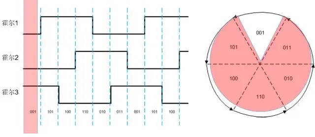 電機(jī)按一定方向轉(zhuǎn)動(dòng)時(shí),3個(gè)霍爾的輸出會(huì)按照6步的規(guī)律變化如下: