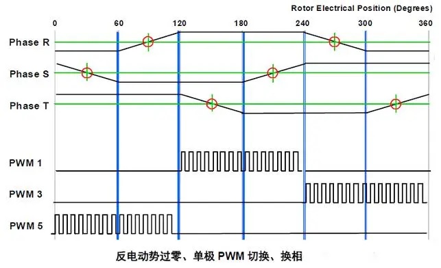基于反電動(dòng)勢(shì)感應(yīng)的技術(shù):基于反電動(dòng)勢(shì)過零來進(jìn)行換相;要求反電動(dòng)勢(shì)足夠高,速度范圍在額定轉(zhuǎn)速的5-10%至100%。