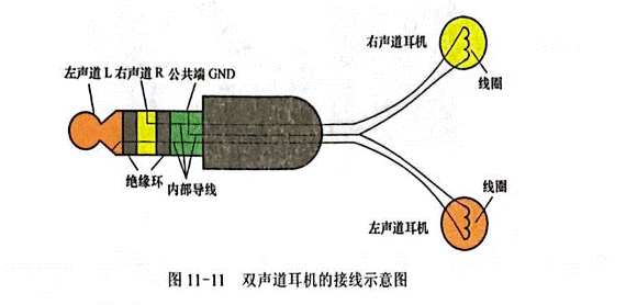 圖11—11所示是雙聲道耳機的接線示意圖,從圖中可以看出,耳機插頭有L、R、公共三個導(dǎo)電節(jié),由兩個絕緣環(huán)隔開,三個導(dǎo)電節(jié)內(nèi)部接出三根導(dǎo)線,一根導(dǎo)線引出后一分為二,三根導(dǎo)線變?yōu)樗母髢蓛膳c左、右聲道耳機線圈連接。