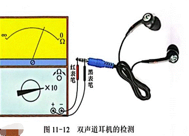 在檢測耳機時,萬用表選擇R×1或R×10擋,先將黑表筆接耳機插頭的公共導(dǎo)電節(jié),紅表筆間斷接觸L導(dǎo)電節(jié),聽左聲道耳機有無聲音,正常耳機有“嚓嚓”聲發(fā)出,紅、黑表筆接觸兩導(dǎo)環(huán)不動時,測得左聲道耳機線圈阻值應(yīng)為幾歐姆到幾百歐姆不等,如圖11—12所示,如果阻值為0或無窮大,表明左聲道耳機線圈短路或開路。然后黑表筆不動,紅表筆間斷接 觸R導(dǎo)電節(jié),檢測右聲道耳機是否正常。