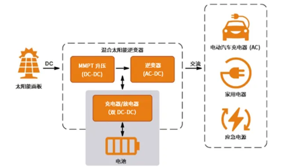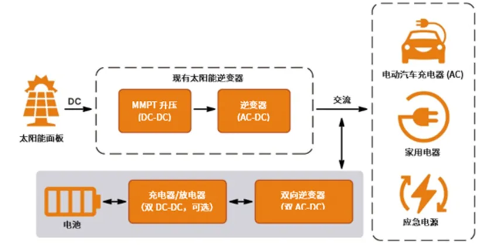 電池儲(chǔ)能系統(tǒng)目前分為兩類,即交流耦合系統(tǒng)和直流耦合系統(tǒng)。交流耦合電池儲(chǔ)能系統(tǒng)是一個(gè)獨(dú)立的系統(tǒng),可以添加到現(xiàn)有的光伏/發(fā)電系統(tǒng)/電網(wǎng)中,因此易于升級(jí)。然而,它需要額外的功率轉(zhuǎn)換級(jí)來(lái)實(shí)現(xiàn)完全充/放電,因此損耗較高。另一方面,直流耦合系統(tǒng)可通過(guò)連接到直流母線以提供額外的儲(chǔ)能能力,通常用于住宅混合光伏逆變器。它只涉及一個(gè)DC-DC轉(zhuǎn)換步驟,因?yàn)橹绷髂妇電壓通常較高,可能會(huì)帶來(lái)安全或改裝方面的挑戰(zhàn),需要在產(chǎn)品設(shè)計(jì)時(shí)提前做出考慮。