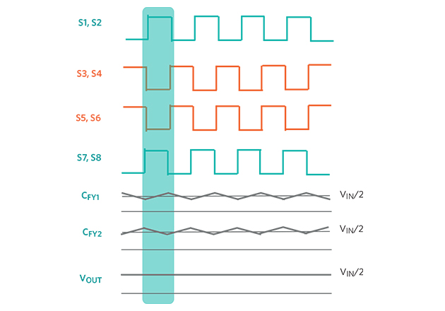 下一個(gè)周期與前一個(gè)周期完全對稱:S1 和 S2 關(guān)閉,S3 和 S4 打開,CFLY1 為負(fù)載供電。同時(shí),S7 和 S8 關(guān)閉,S5 和 S6 打開。CFLY2 充電,同時(shí)也為負(fù)載供電。兩相操作減少了輸出電容上的紋波。